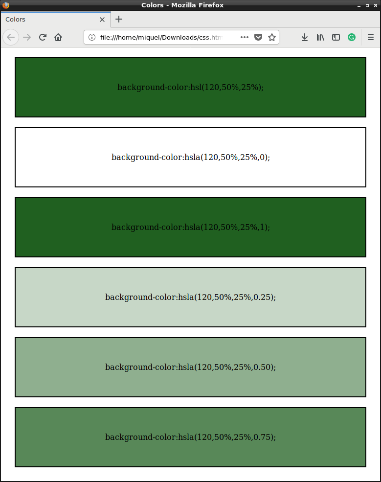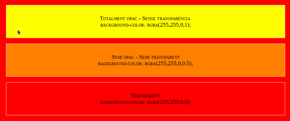 En la secció hsla hi ha un altre exemple d'aplicació de la transparència/opacitat utilitzant el model HSL tot i que el funcionament de la transparència és exactament el mateix.